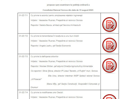 Cu privire la alegerea Vicepreședintelui raionului Soroca Cu privire la alegerea Vicepreședintelui raionului Soroca Cu privire la încetarea mandatelor Vicepreședinților raionului Soroca Cu privire la acordul pentru amplasarea rețelelor inginerești Cu privire la dispunerea măsurilor pentru luarea în evidență militară tinerilor anul nașterii 2008și încorporarea în serviciul militar în termen, serviciul militar cu termen redus și cel civil, pe perioada anului 2024 Cu privire la transmiterea în locațiune a unor bunuri imobile Cu privire la aprobarea Planului de acțiuni al Consiliului raional soroca pentru anul 2024 Cu [...]